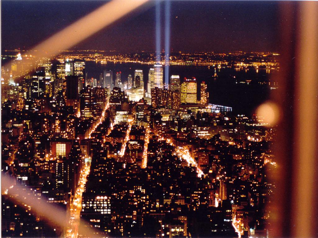 Twin Tower tribute lights in March of 2002