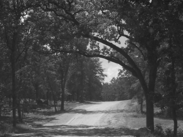A long pathway surrounded by trees